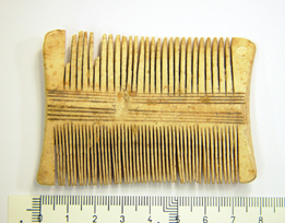 I decided to start my hair-dressing search with a dependable source, The Viking Answer Lady. The site creator, Gunnora, is a personal friend of mine and I've always admired her dedication to research. The page looks kind of dated, but she regularly updates the research and is absolutely willing to change her statements if she gets new information. The first thing I noticed is the collection of combs that she shows off in various museums. While many of the museum finds are ivory or bone, there is discussion of wooden combs in the same style. They looked really familiar and I knew I wanted one. I did a little poking around and discovered there are a number of shops on etsy that carry "beard combs". The same big tooth/ little tooth shape and small enough to fit in your hand but big enough to do the job. The prices range from about what I'd pay for a normal plastic comb all the way up to the super carved and personalized double digit ones.
